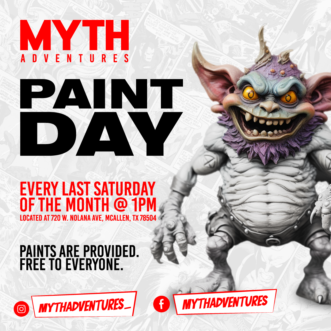 More InfoMiniature Painting Days happen every last Saturday of the Month at Myth! A majority of our painting days are free and open to the public. A select few of these events will require a small entry fee which includes a preprinted mini to paint as well as a raffle ticket for the chance to win a larger scale 3D printed painted miniaturePaint Days are a great event if you are a miniature gaming enthusiast. This is especially true if you've been meaning to learn about the art of painting miniatures because you will be surrounded by individuals who have expert knowledge on the subject!